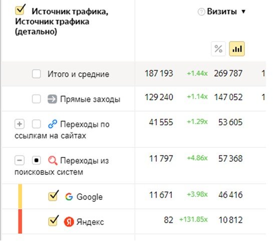 Таким образом, за год процент поискового трафика из Google увеличился на 298%, из Яндекса на 13085%, а общее количество переходов из поисковых систем возросло на 386%.