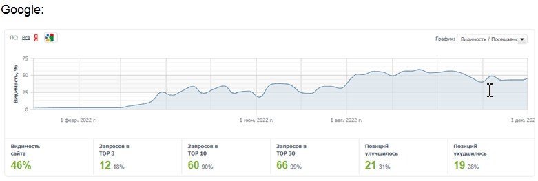 Сумев вывести сайт из-под фильтра в Яндексе, мы добились значительного роста трафика и укрепления позиций. В Google сайт чувствует себя гораздо увереннее. Видимость сайта выросла до 46%. В ТОП-10 находятся 60 ключевых запросов.