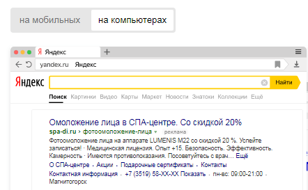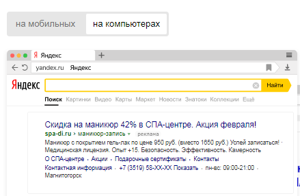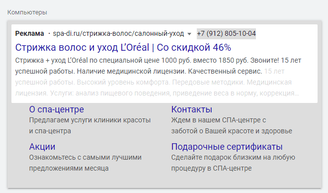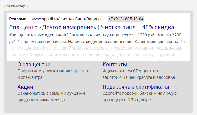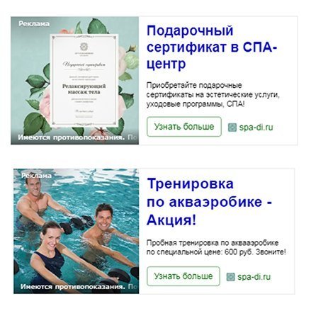 6). Для того, чтобы не тратить деньги впустую, так как у сайта клиента отлично осуществлена SEO-оптимизация, и показ услуг спа-центра показывается в поисковой выдаче, мы решили осуществлять показ только по действующим акциям.