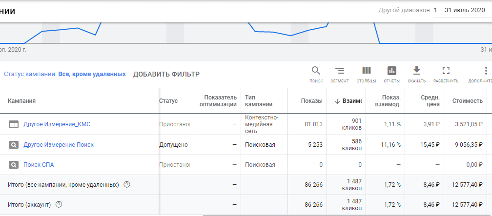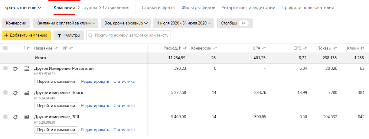 Данные с личного кабинета Яндекс Директ в Июле 2020