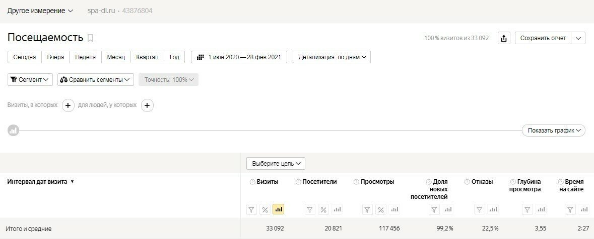 На данный момент мы продолжаем плодотворное сотрудничество со СПА-центром «Другое измерение», регулярно обновляем акции в объявлениях, настраиваем Ретаргетинг по базе клиентов и собираем данные о посетивших сайт. Можно посмотреть на графике количество посетителей с Июня 2020 по Февраль 2021. Ниже графика расшифровка показателей Яндекс Метрики.