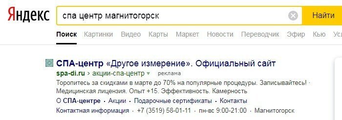 Рекламное объявление СПА-центра «Другое измерение» в Яндекс