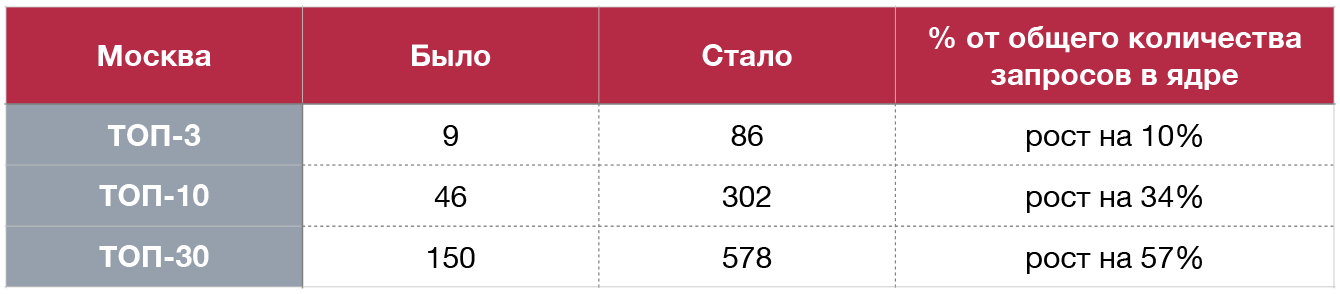 Результатом проведенных работ стал рост видимости в обоих регионах. Удалось улучшить видимость основного домена в ТОП10 в Москве — в 7 раз: