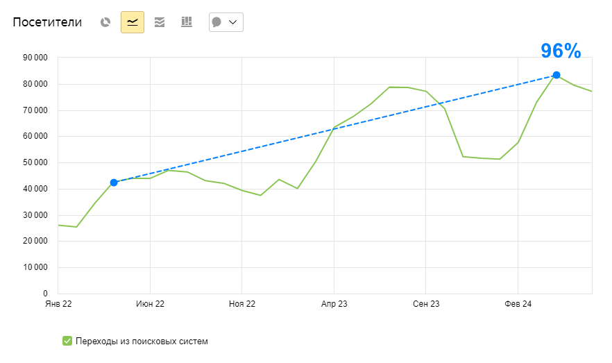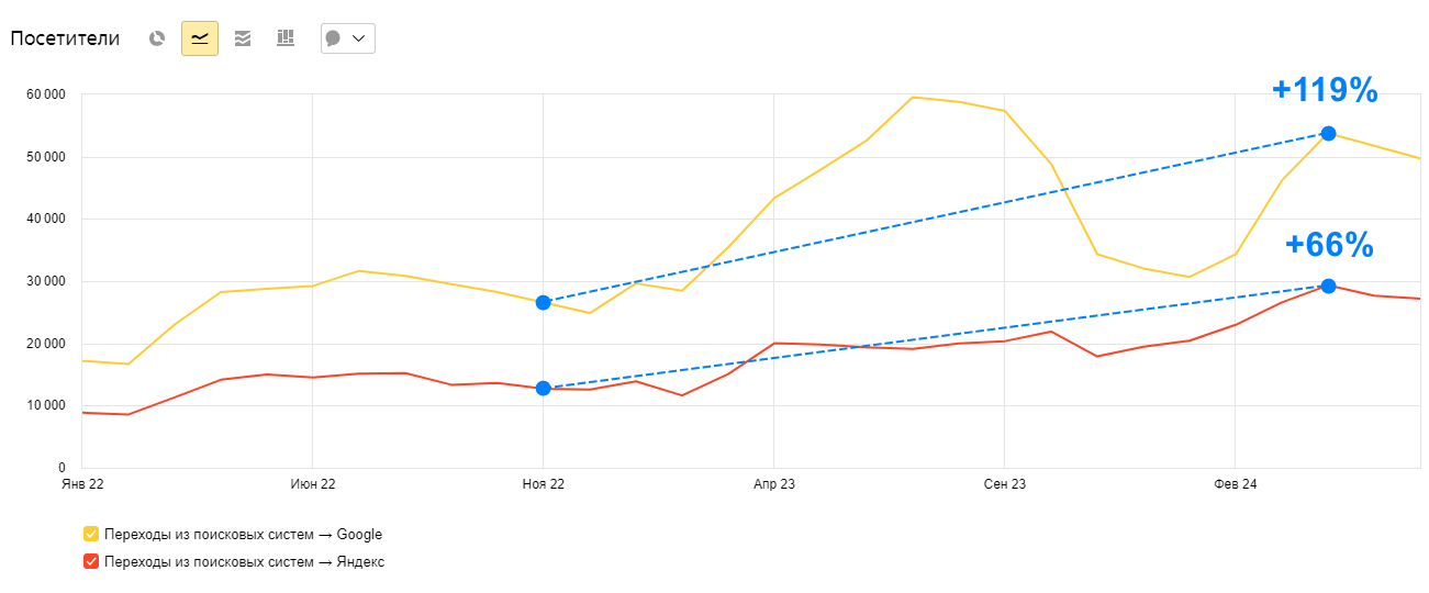 По результатам 19 месяцев работ по продвижению (от начала сотрудничества) достигли роста посетителей из поисковых систем на 119% в Google и на 66% в Яндекс:
