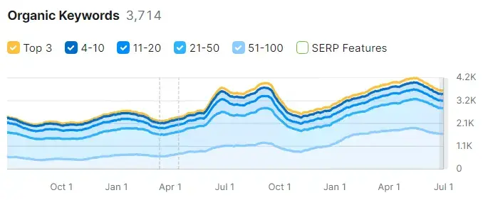 Отметим также рост позиций в ранжировании. График роста количества ключевых фраз в топах Google от сервиса semrush.com: