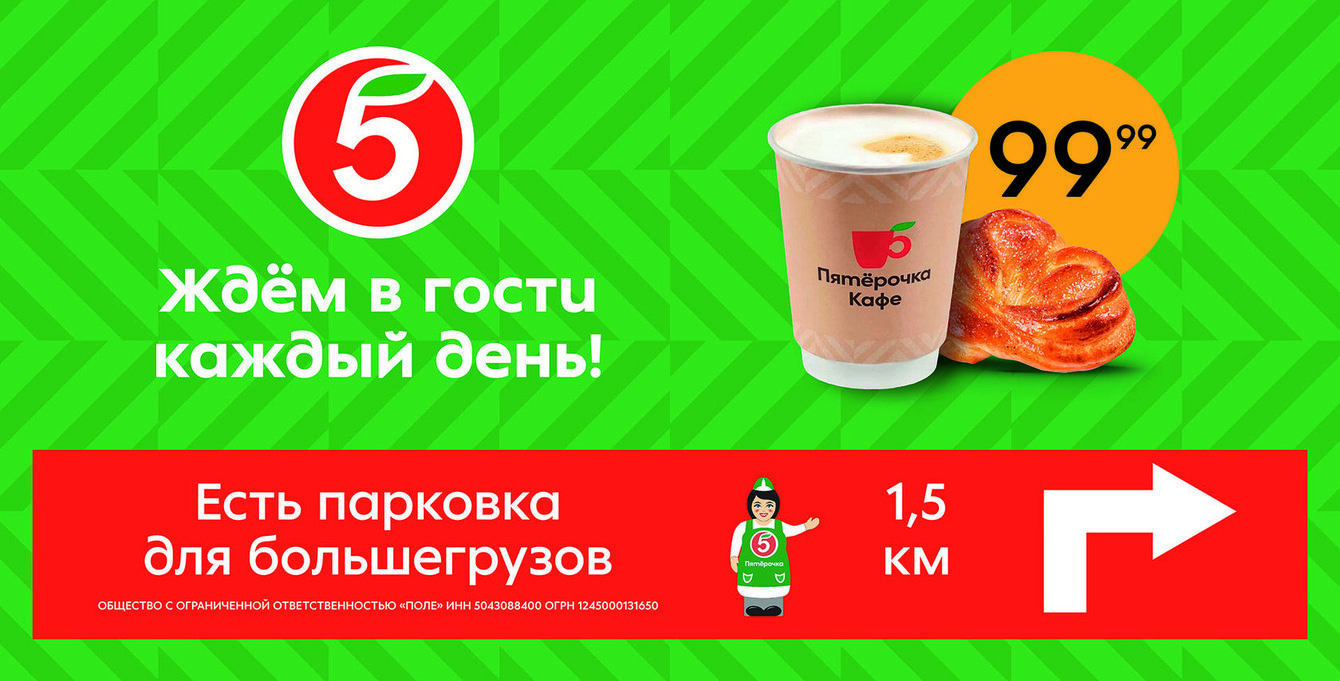 Разработать указательный макет для билборда с ярким оффером, ориентированный на водителей и дальнобойщиков, направляющий трафик к точке продаж. Важно: соблюдение фирменного стиля и акцент на удобстве восприятия с дороги