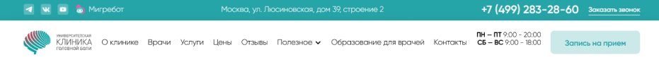 По мере необходимости вносим корректировки. Из последних – редизайн шапки и футера сайта. Мы декомпозировали хаотичные элементы. Добавили в шапку важные контактные данные: номер телефона, адрес клиники, время работы.