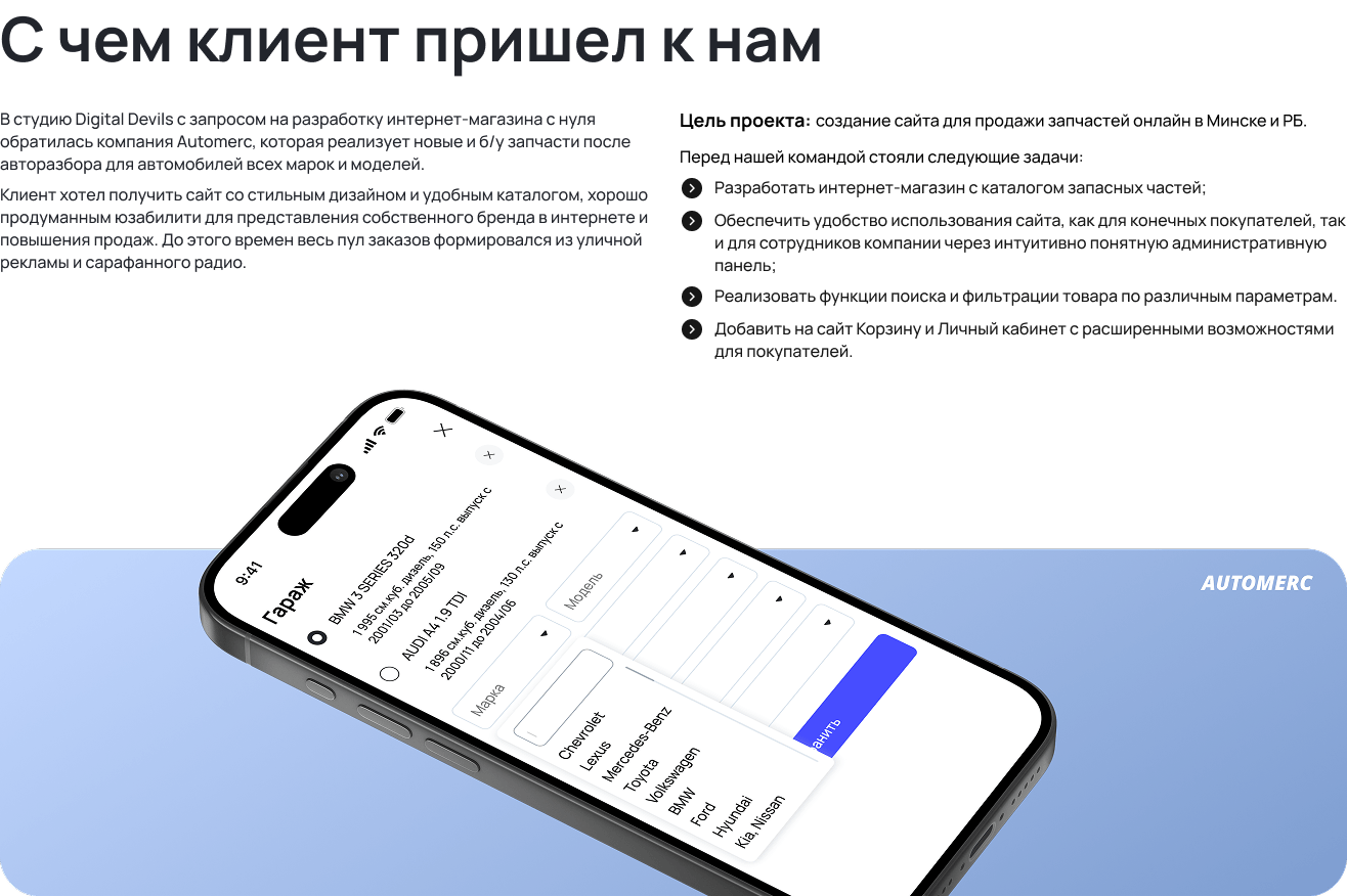 В студию Digital Devils с запросом на разработку интернет-магазина с нуля обратилась компания Automerc, которая реализует новые и б/у запчасти после авторазбора для автомобилей всех марок и моделей.