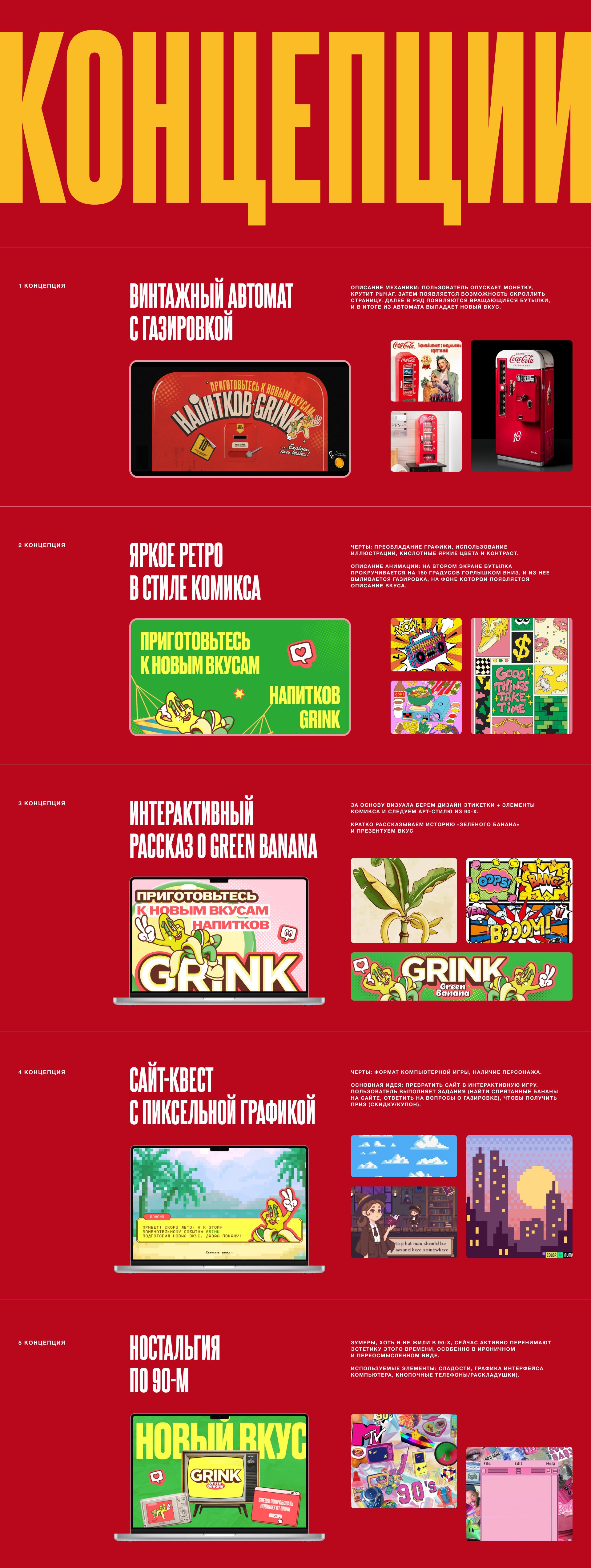 Grink — молодежный бренд газированных напитков с ярким и дерзким стилем. Мы работаем с ним не первый год: почти ежегодно создаем промо-проекты для новых вкусов. На этот раз задача — представить вкус Green Banana и привлечь внимание ключевой аудитории бренда.