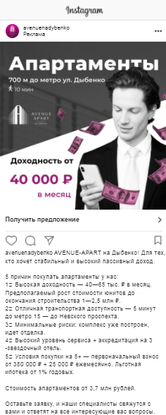 Баннер, который приносил самые дешевые обращения, в районе 700–800 ₽ за одно. Но он, скорее, транслирует предложение для собственного проживания, а не инвестиций, поэтому на данный момент мы его не используем