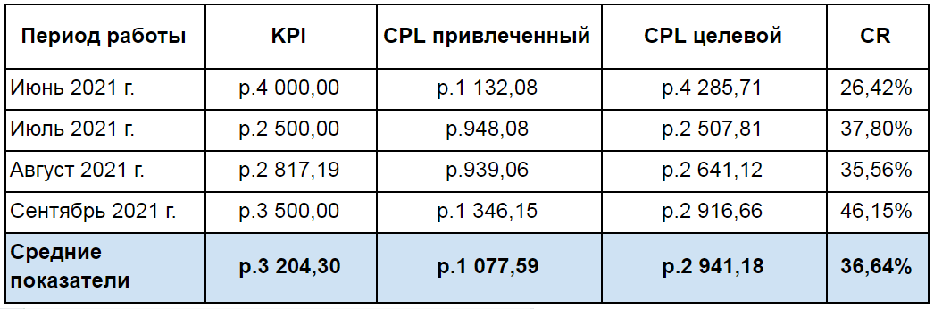 Стоимость лида и конверсия менялись каждый отчетный период. Например, в первый месяц мы получили 53 лида, целевых из которых было 14. Конверсия из привлеченного лида в целевой составила 26,42% — чуть ниже, чем в среднем по рынку (≈ 30–35%).