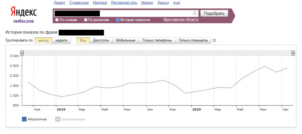 Для вывода в ТОП и набора первичной статистики была выбрана стратегия продвижения по большому количеству средне и низкочастотных запросов. Для этого еще на этапе разработки мы провели анализ спроса.