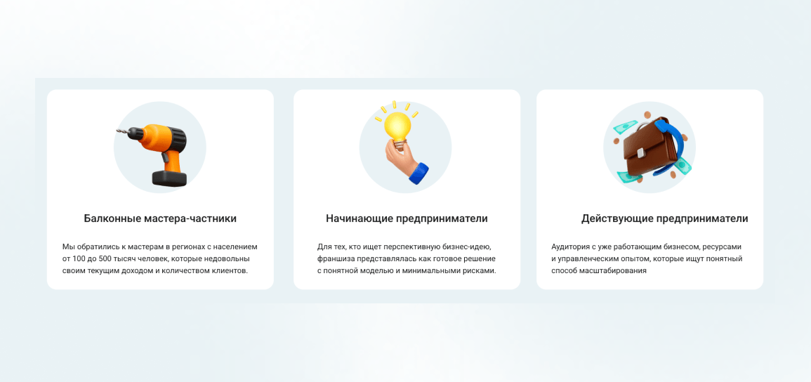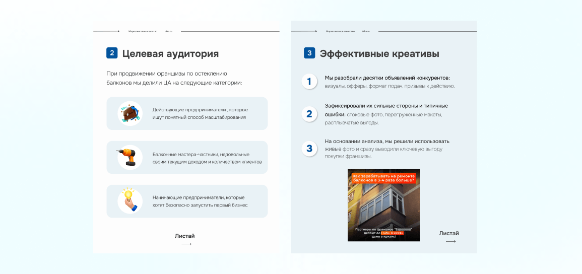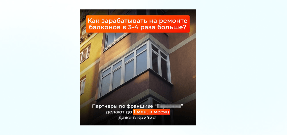 Креативы для рекламы франшизы по остеклению балконов должен привлекать предпринимателей, а не конечных клиентов. Показывать нужно не просто красивые балконы, а бизнес-потенциал: успешные франчайзи, поддержку компании, готовые проекты, команду.