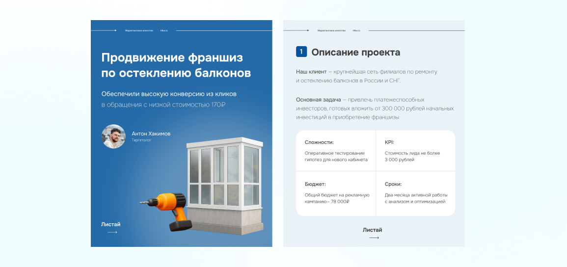 «Привет! Меня зовут Антон, я таргетолог. В нашем агентстве мы постоянно работаем с проектами по продвижению франшиз. Для этого клиента, продвигающего франшизу по остеклению балконов, через ВКонтакте обеспечили высокую конверсию из кликов в обращения с низкой стоимостью 170р»
