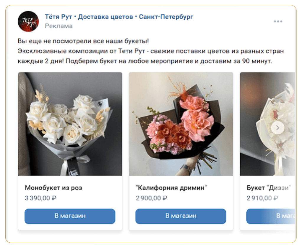 Объявление в формате карусели с «топовыми букетами». С него получили 7 заявок по цене 720 рублей и 3 продажи