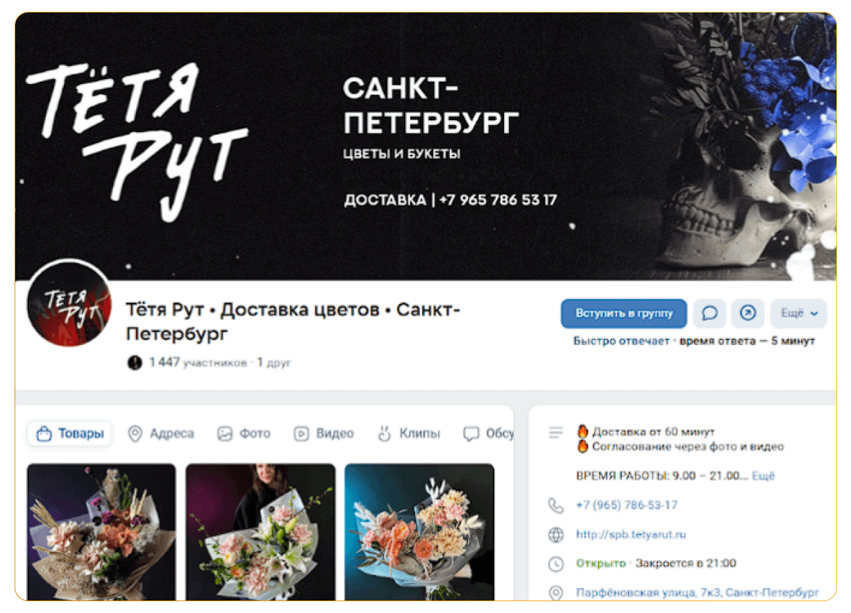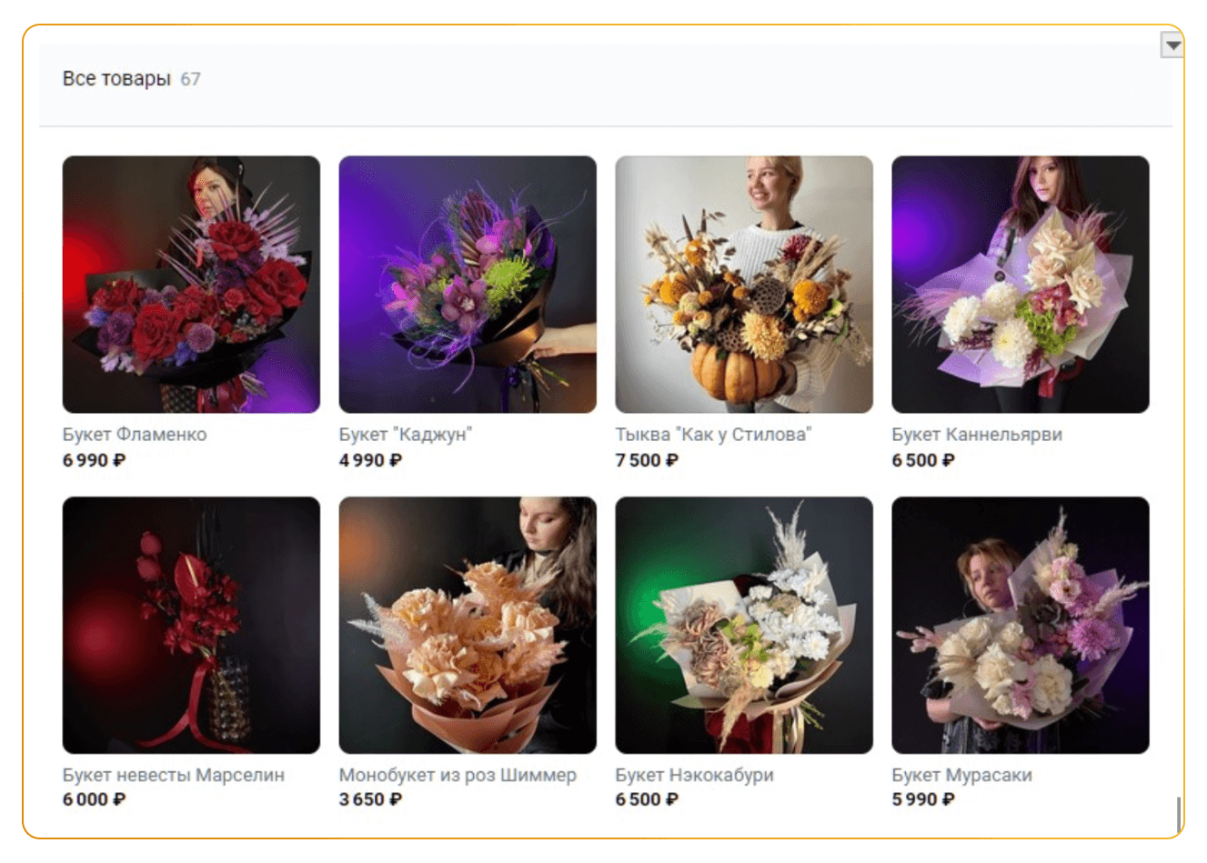 Раздел «Товары» — своеобразная онлайн-витрина для соцсетей цветочного магазина. Важно, чтобы здесь всегда был представлен актуальный ассортимент.