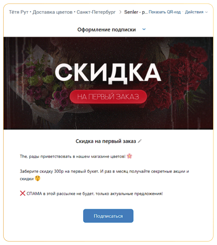 Приветственное сообщение с акционным предложением мотивирует подписываться на рассылку