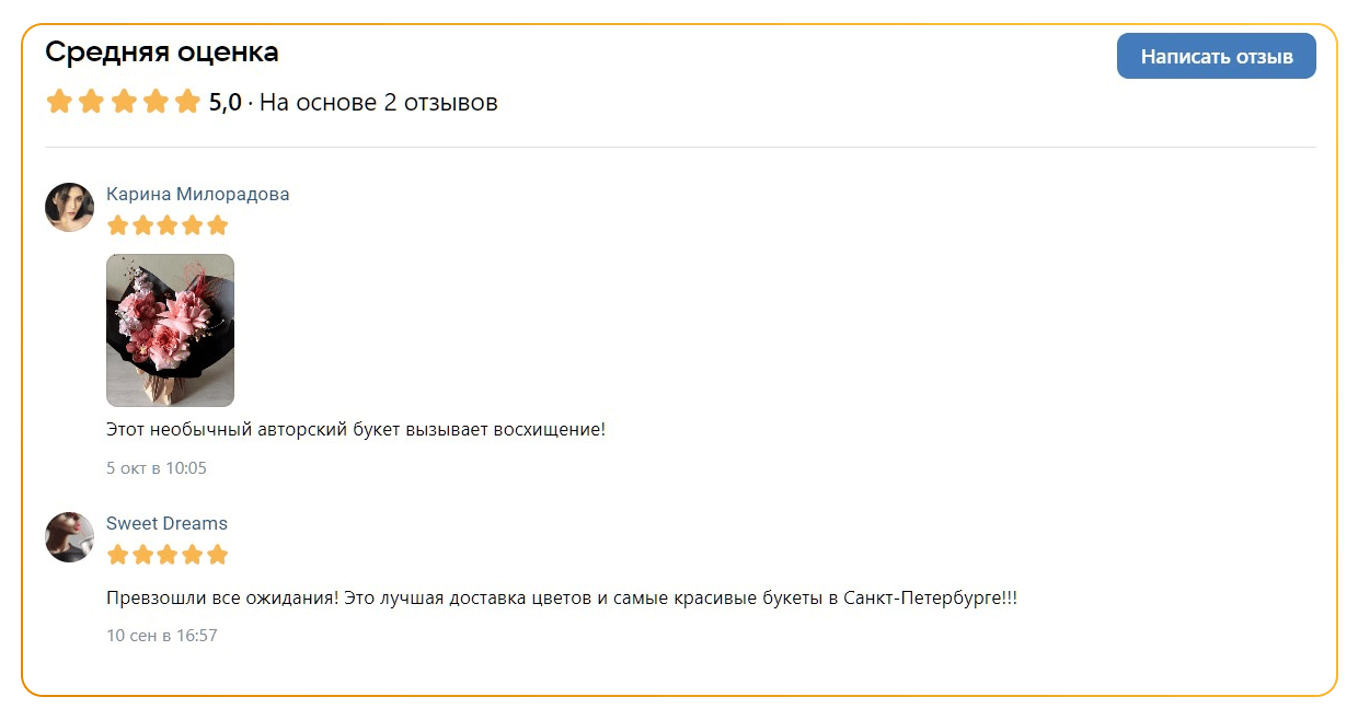 - Добавили раздел с отзывами. Теперь посетители сообщества видят, что клиенты довольны букетами и сервисом. Это помогает повысить лояльность аудитории и закрыть возможные возражения потенциальных покупателей.