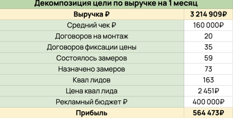На первый месяц: при бюджете 400 000 ₽ получить 20 монтажных договоров, 35 договоров фиксации цены, 59 состоявшихся замеров и 163 квалифицированных лида. Планируемая выручка 3 214 909 ₽, планируемая прибыль — 564 473 ₽.