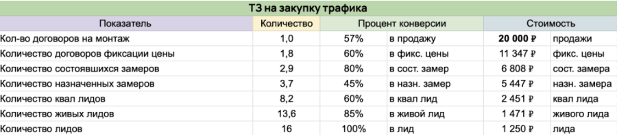 Для этого мы разработали детализированное ТЗ на закупку трафика, где каждый этап воронки оценивается через ключевые показатели: количество лидов, конверсию и стоимость на каждом шаге.