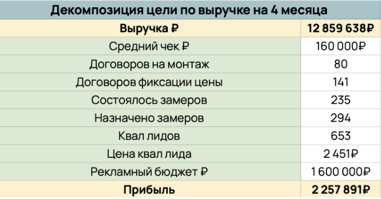 На 4 месяца: при бюджете 1,6 млн ₽ получить 80 монтажных договоров, договоров фиксации цены — 141, состоявшихся замеров — 235, квалифицированных лидов — 653. Планируемая выручка 12 859 638 ₽, планируемая прибыль — 2 257 891 ₽.