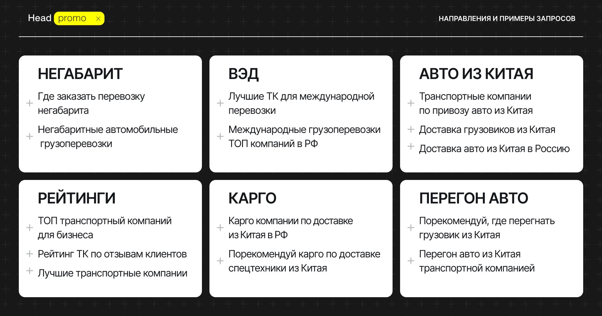 Мы собрали к каждому направлению запросы-промпты для продвижения в ответах ИИ, всего получилось более 100 запросов.