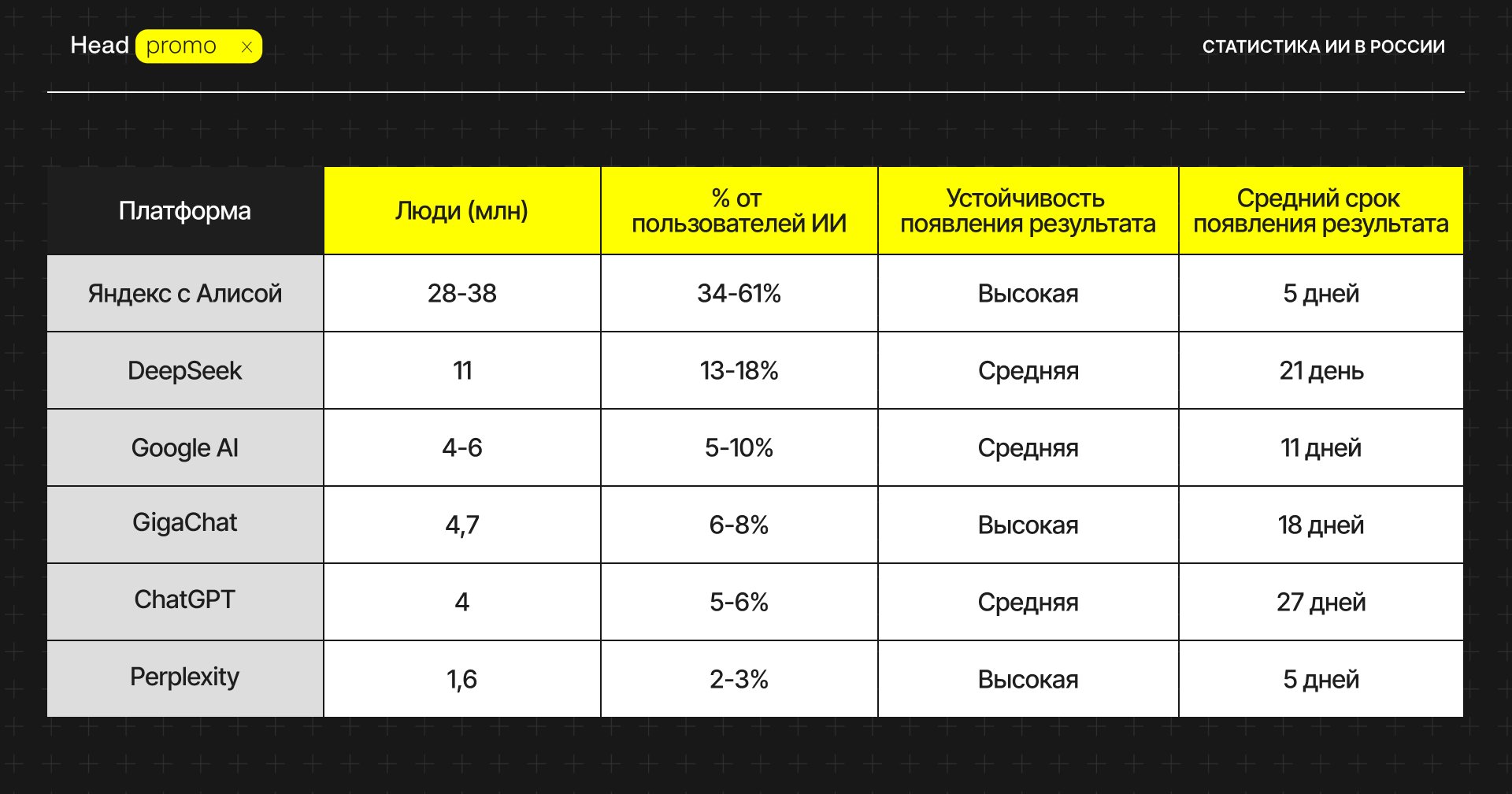 Мы провели исследование, данные говорят нам, что в России имеет смысл работать со следующими ИИ: