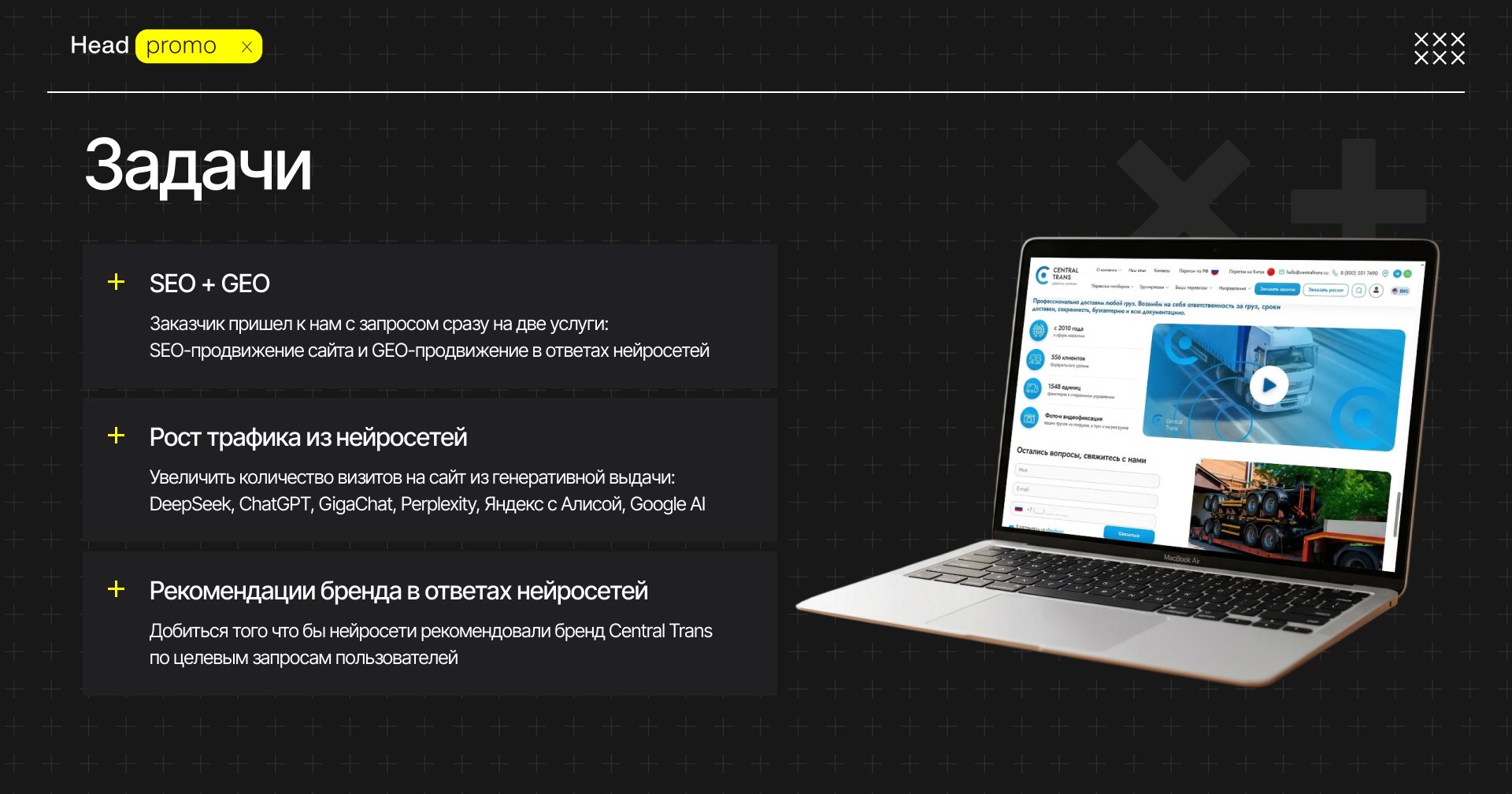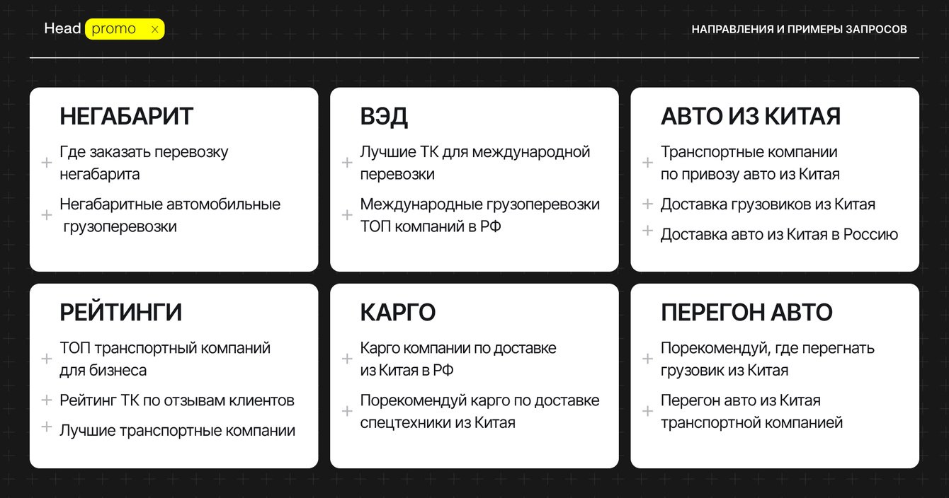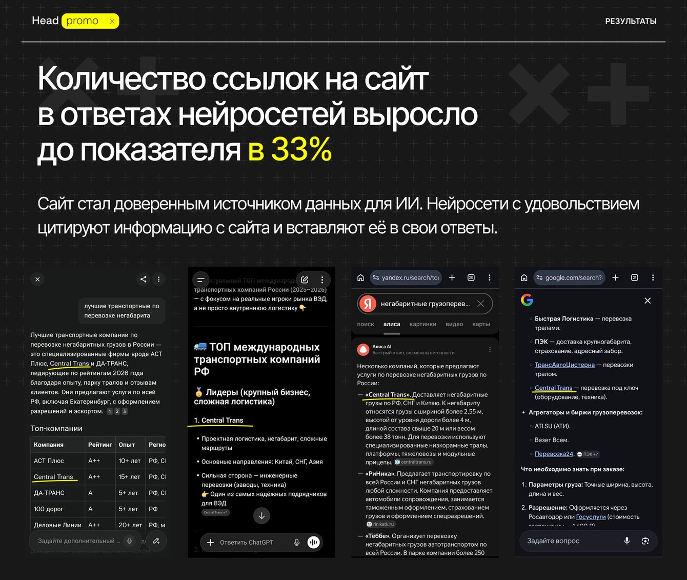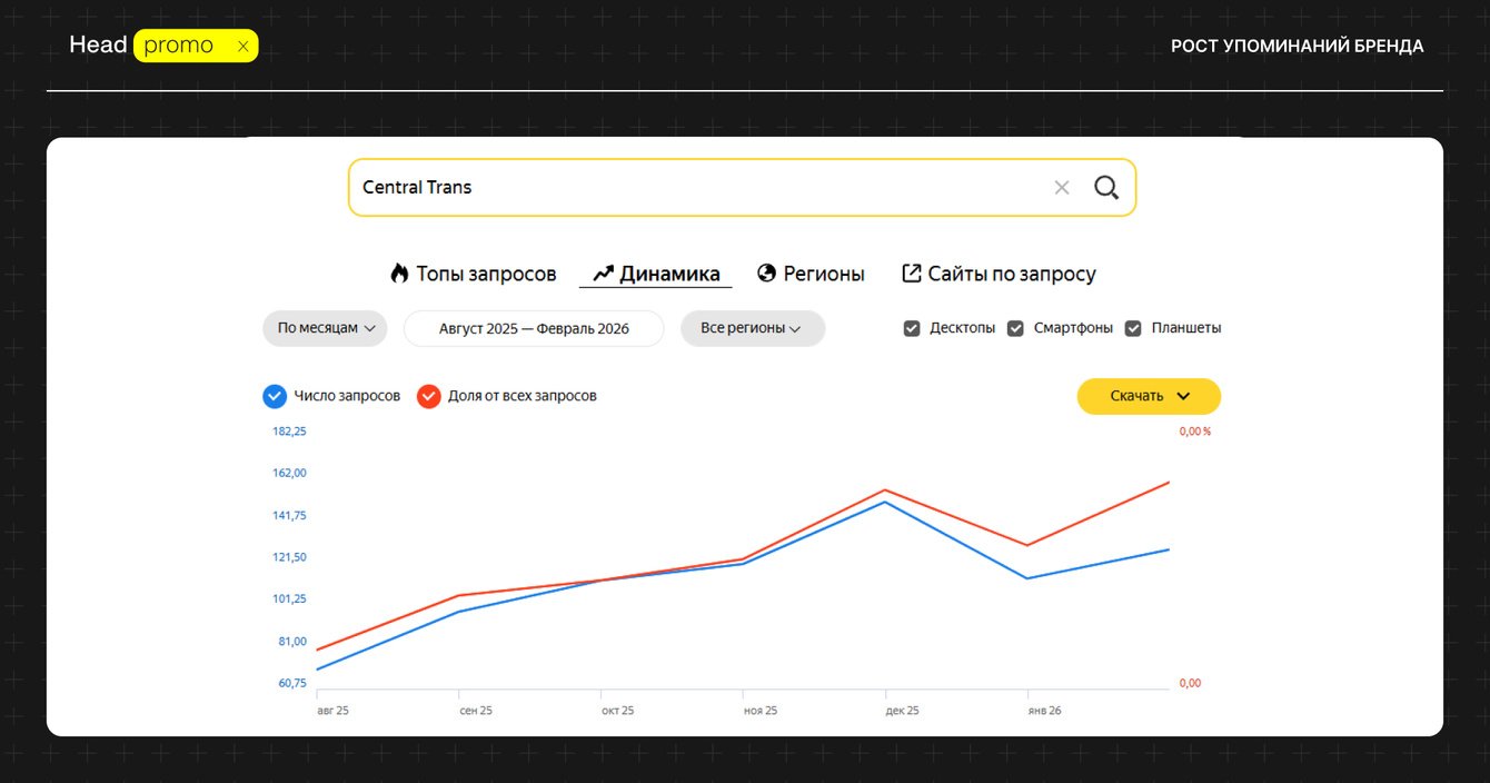 Наш первый коммерческий заказчик, который пришел к нам, когда ещё услугу по продвижению в ответах нейросетей практически никто не оказывал, а у нас был только кейс по продвижению собственного агентства. Это доверие послужило отправной точкой развития нового двигателя агентства. С гордостью публикуем кейс и результаты компании Central Trans, которая не побоялась использовать новые методы продвижения и выиграла в PR, узнаваемости в ИИ и трафике.