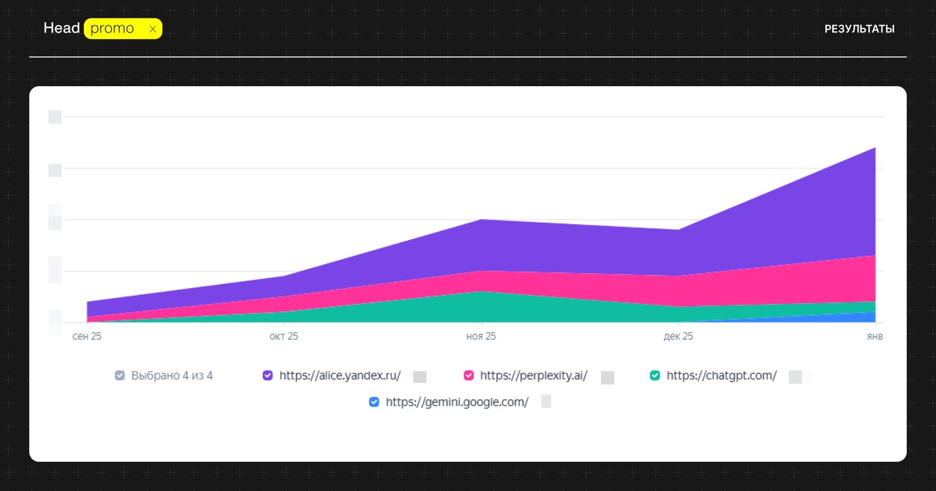 На начальном этапе видимость бренда составляла 1%, иногда бренд показывался в ответах Perplexity и пару раз в Яндекс Алисе.