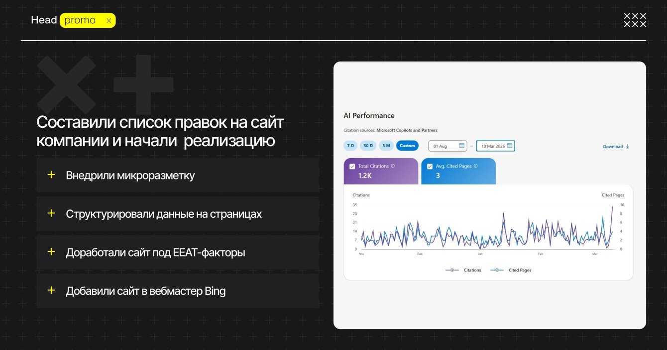 На момент старта у нас уже был опыт работы по продвижению сайта своего агентства, мы выпустили подробный гайд по GEO на WorkSpace, провели исследование аудитории и понимали алгоритмы продвижения.