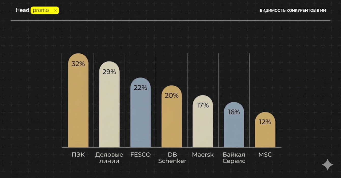 При этом видимость конкурентов по тем же промптам была существенно выше, например ТК ПЭК показывалась в 32% случаев.