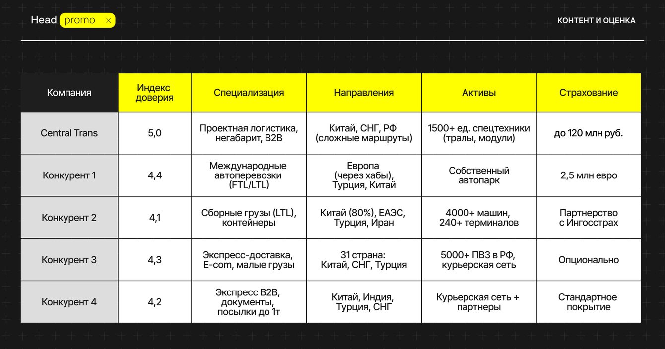 Руководство Central Trans выражает огромную благодарность команде Head Promo за круглые результаты и технологический прорыв в продвижении нашего бренда.