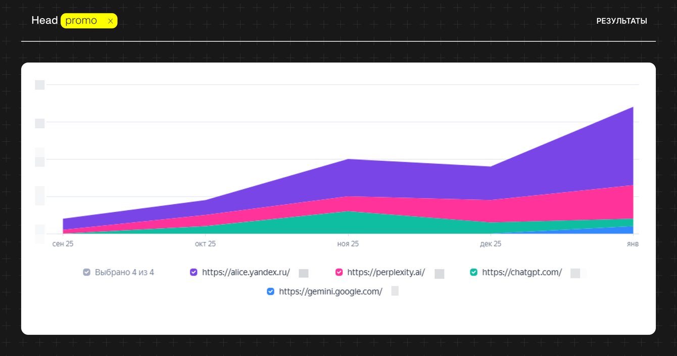 Трафик на сайт заказчика именно из нейросетей тоже существенно вырос, особенно из Алисы. У неё самая большая аудитория в России.