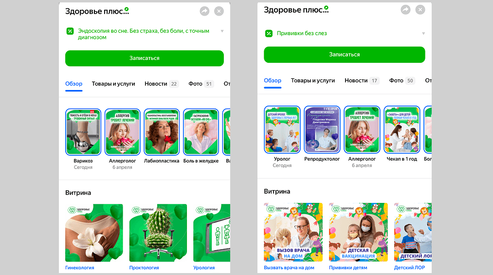 Подготовили блоки с услугами, врачами и акциями. Например, в детском филиале вывели на витрину «Программа наблюдения до года» и «Вакцинация без очереди». Сторис сделали с реальными фото клиники и короткими видео кабинетов. Это повысило доверие и кликабельность — человек видит, куда он идет.