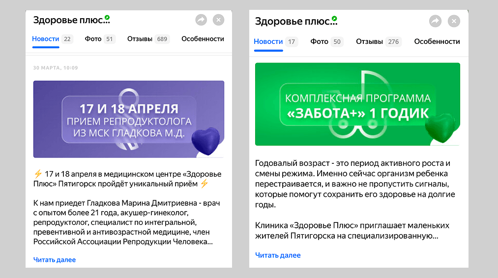 Мы завели правило: каждый понедельник — новая публикация. Это мог быть пост о приеме узкого специалиста, напоминание о сезонной акции или полезный текст («5 признаков, что пора к аллергологу»). Алгоритмы Яндекса получили регулярные сигналы активности, и карточка начала подниматься в выдаче.