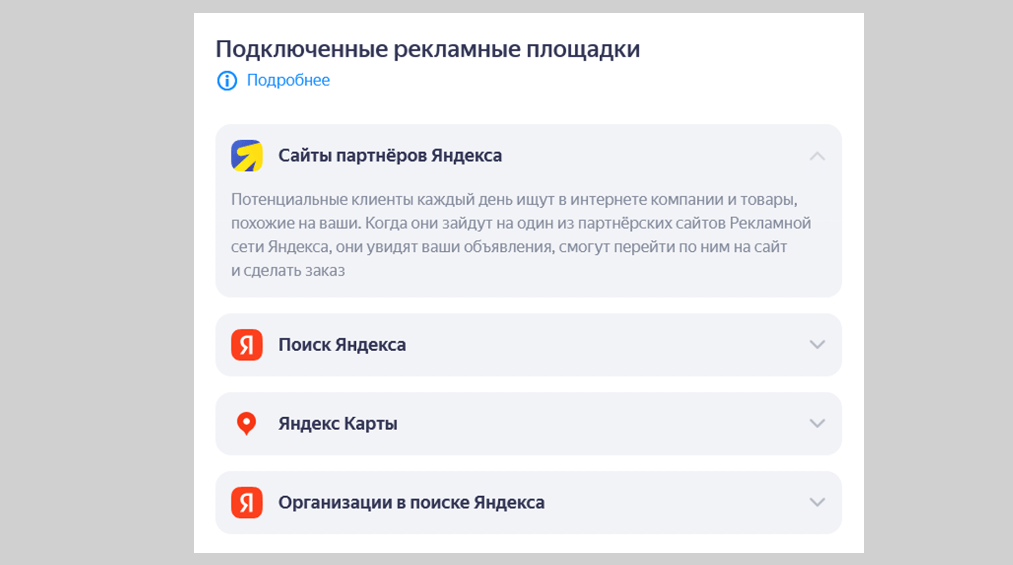 Мы отключили все, что не приносило целевых действий: РСЯ, Поиск, партнерские площадки. Вручную скорректировали площадки: оставили только Яндекс Карты и, частично, Навигатор. Все остальное отключили.