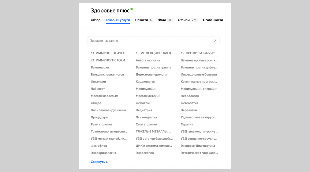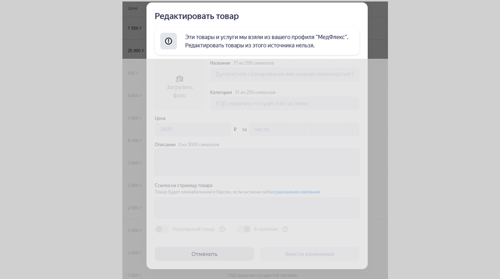 Плюс услуги автоматически подтягивались из внешней системы «МедФлекс». В результате в Яндекс Бизнесе нельзя было вручную править прайс, менять структуру услуг или добавлять описания.