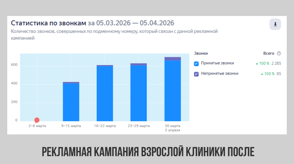 Рекламный бюджет распределялся автоматически на все площадки Яндекса — включая РСЯ (рекламную сеть Яндекса) и Поиск. Формат карточки на этих площадках не работает как канал привлечения пациентов. Люди кликали, но не звонили — потому что контекст был не тот. Деньги уходили впустую.