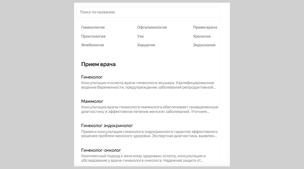 Из-за «МедФлекса» в карточках висел длинный, неструктурированный список услуг без единого пояснения. Например: «УЗИ брюшной полости» — и цена. Без описания, что это дает пациенту, без ключевых слов. Алгоритмы Яндекса не могли понять, по каким запросам показывать эту карточку. А человек, листая, не видел причин выбирать именно эту клинику.