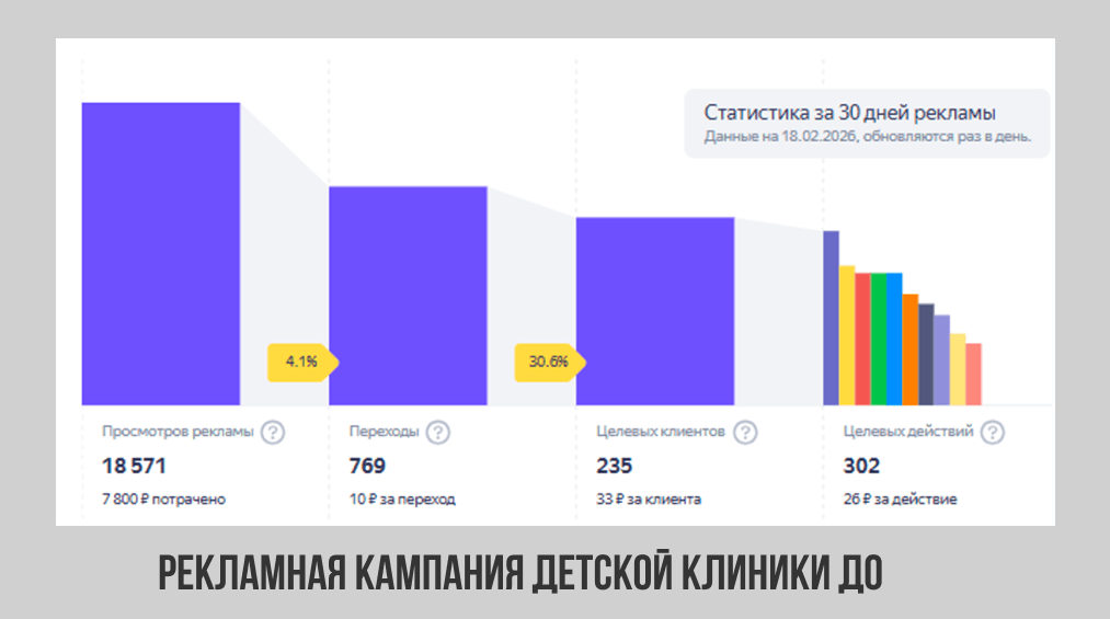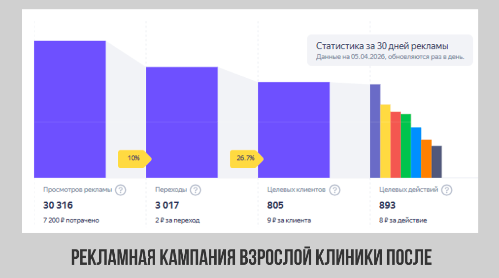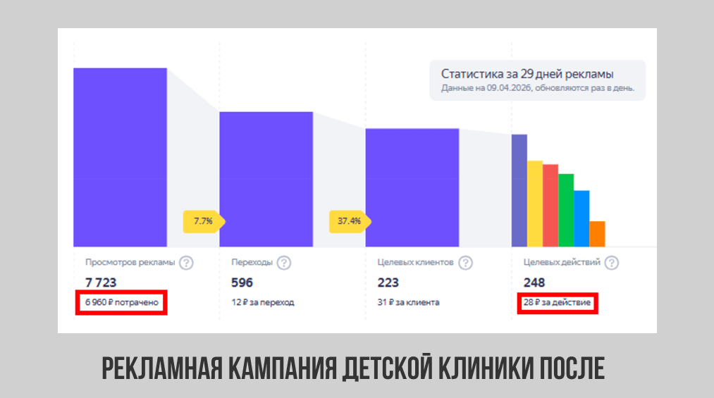 Стоимость целевого действия незначительно повысилась (с 26 до 28 рублей), но это плата за рост объема и качества трафика. Детская клиника получила на треть больше живых обращений — и это главный результат.