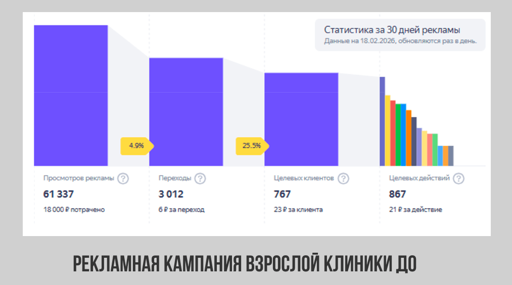 По взрослой клинике после отключения неэффективных площадок мы снизили расходы с 18 000 до 7 200 рублей. Количество переходов осталось почти тем же — 3 012 против 3 017, а целевых действий (звонки, маршруты, переходы на сайт) стало больше: с 867 до 893. Стоимость одного целевого действия снизилась с 21 до 8 рублей.