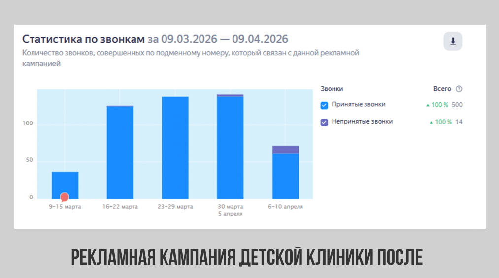 В детской клинике бюджет снизили — с 7 800 до 6 960 рублей (–13%), но количество принятых звонков выросло с 375 до 500 (+33%). Клики по телефону увеличились на 13% (с 143 до 162), маршрутов стало на 21% больше, переходов на сайт — на 23%.
