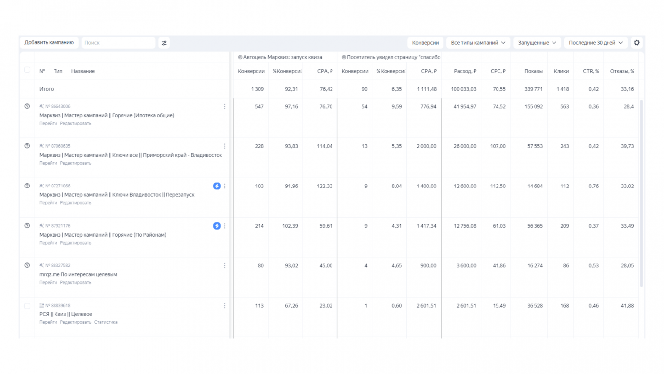 Первые запуски были дорогие: получили несколько лидов с ценой в 2400 руб. После начали оптимизировать работу с офферами, оставляя эффективные, и продолжали запускать новые предложения для клиентов, чтобы получать лиды на разный уровень недвижимости. В текущем проекте продвигали недвижимость уровня: