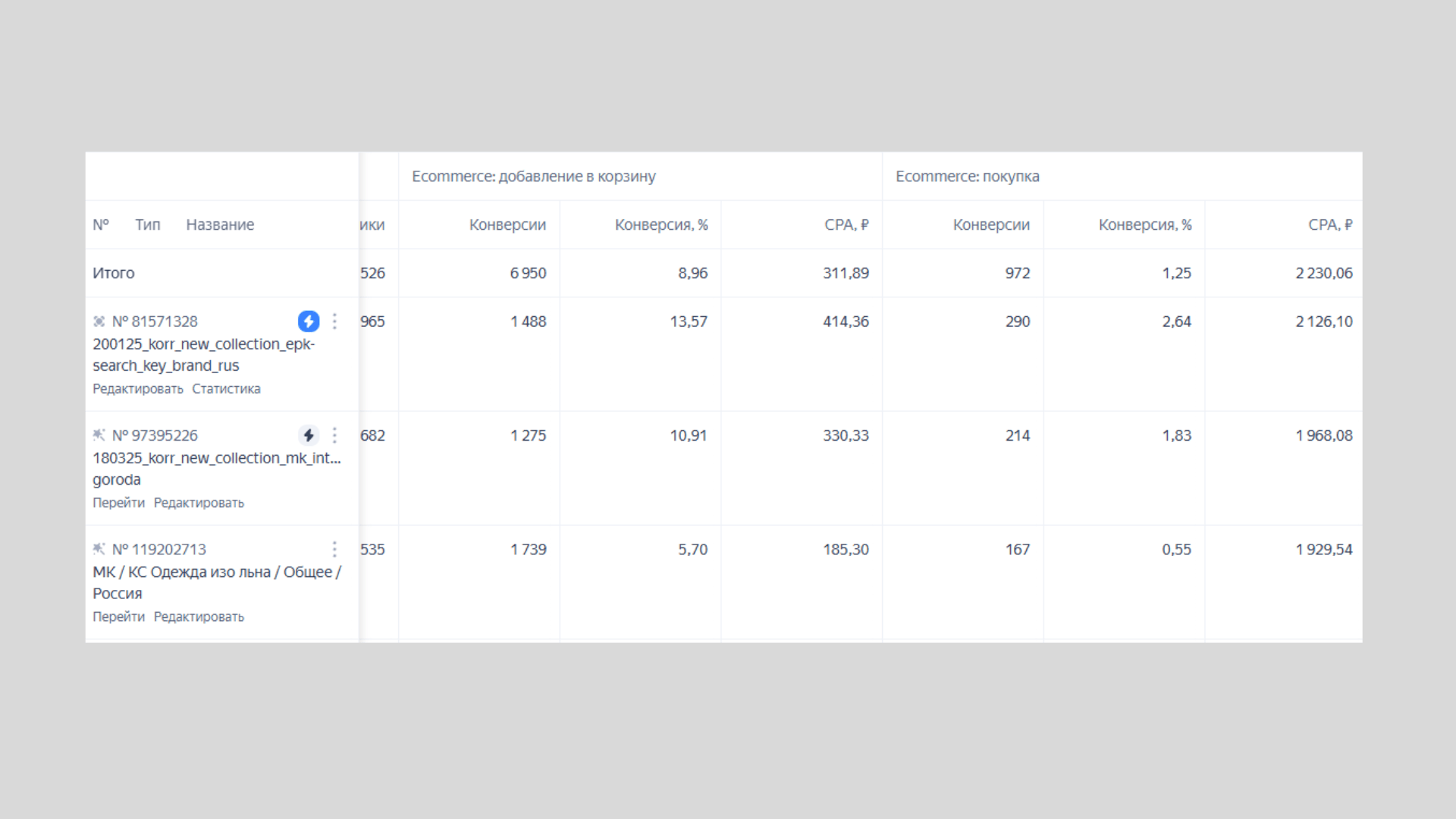 2. РК направленные на одежду нового сезона мало того, что приносят нам самый низкий CPA и много продаж, но и прокачивают брендовые РК и ретаргет. Для сравнения: топовая рк на бренд и МК на лен. Корзины и покупки нам обходятся дешевле до сих пор, чем с самого горячего брендового трафика;