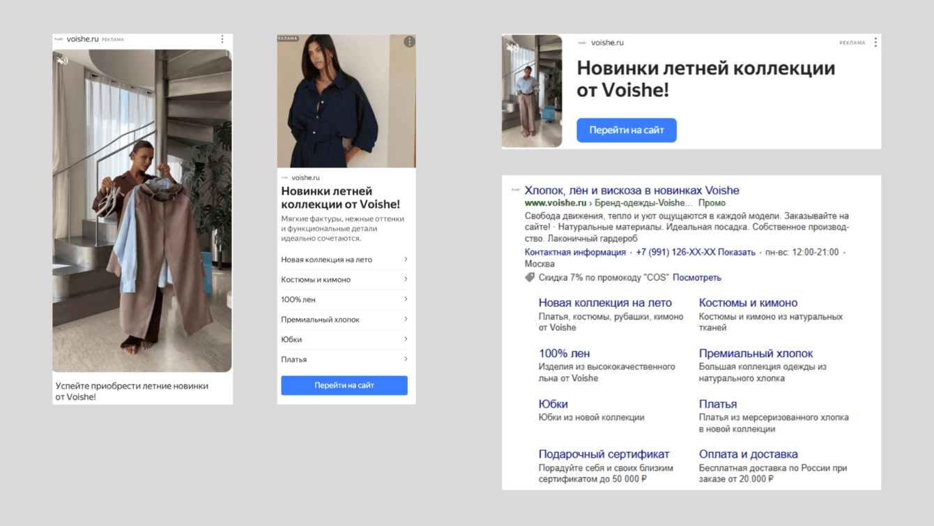 С проектом VOISHE работаем достаточно давно, около 3-х лет, и все рабочие связки инструменты нам уже знакомы и привычны. Товарные РК на основе фидов, смарт-баннеры, ретаргет, поиск бренд, рся — все это используется в разной степени в зависимости от сезона, спроса, остатков одежды и т.п. Знаем, какие работают лучше, а какие хуже, поэтому с каждым, в том числе и новым, проектом мы знаем, как подходить к работе и от чего отталкиваться.