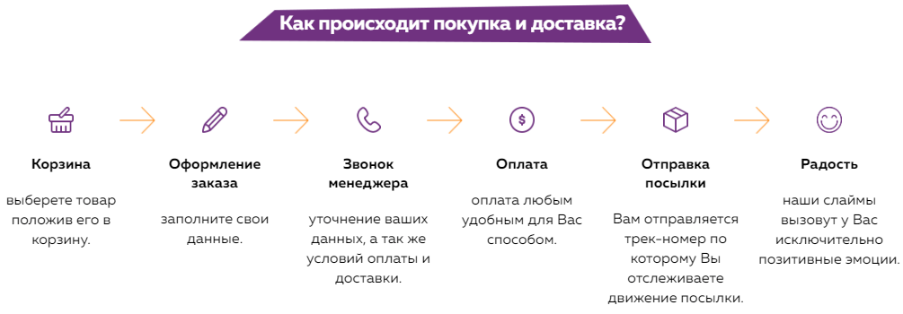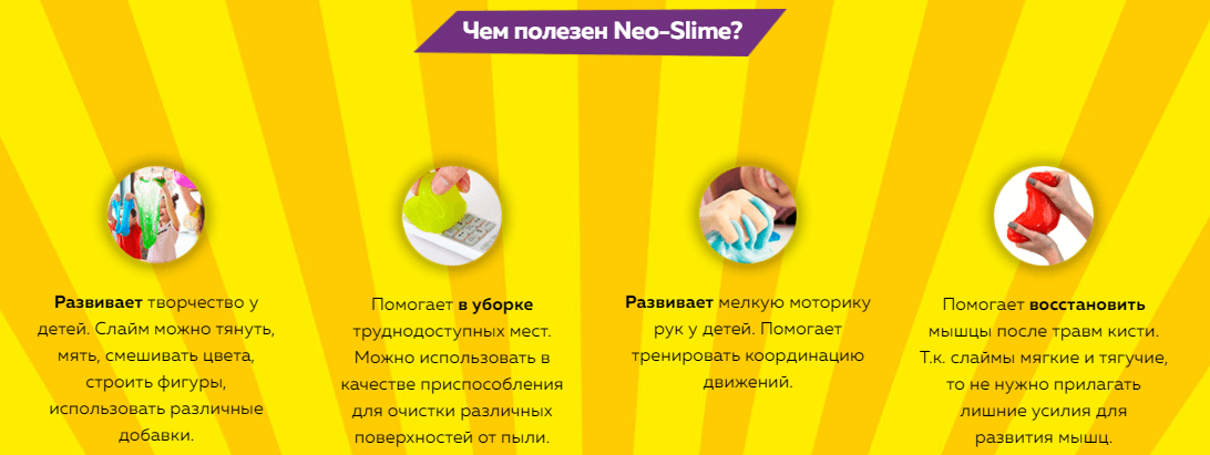 Итак, на первом экране пользователь узнает предназначение продукта: с одной стороны, это игрушка для развития мелкой моторики у детей, а с другой - антистресс для взрослого. Мы обращаем внимание посетителя сайта, что это универсальный продукт. При этом, для детей он абсолютно безопасен: слаймы данного производителя НЕ содержат тетраборат натрия, который может вызвать дерматит и кожную сыпь, а также отравление при попадании в организм. Это весомое преимущество перед слаймами, созданными в домашних условиях. Для них как раз и требуется это вещество.