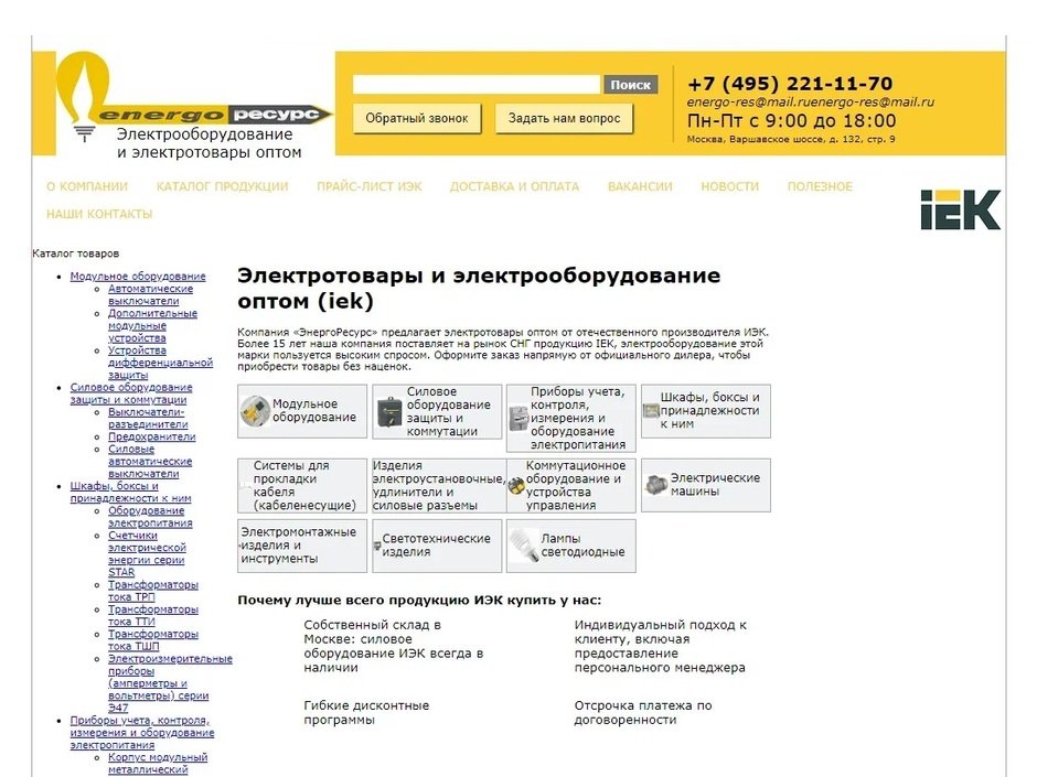 ООО «Энергоресурс» - официальный представитель бренда IEK в России и странах СНГ. Компания реализует все виды низковольтного электротехнического оборудования. Товары отвечают всем современным стандартам и используются даже в регионах со сложными климатическими условиями.