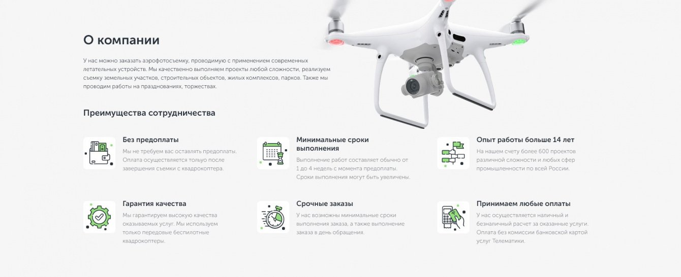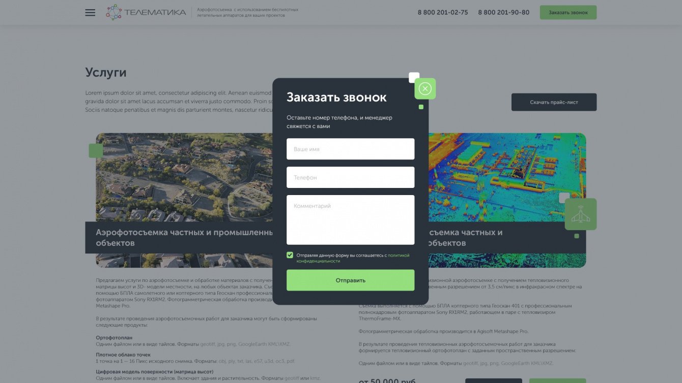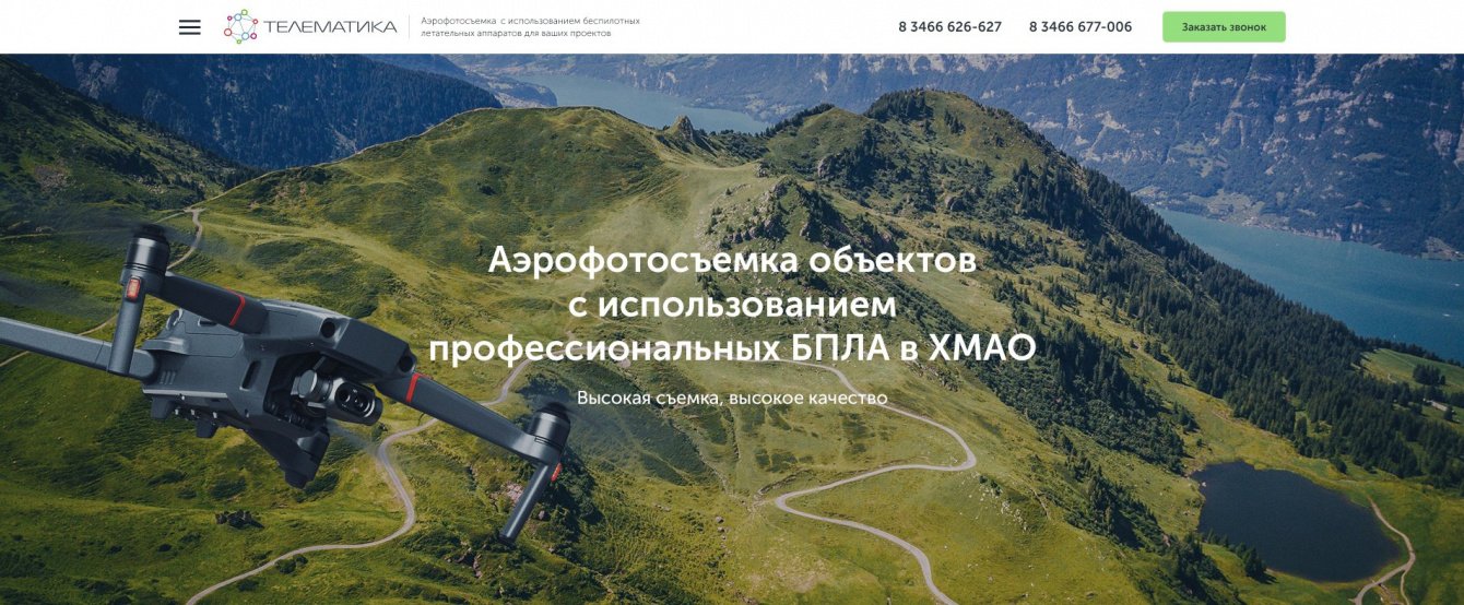 За разработкой лендинга к нам обратилась компания «Телематика». Требовалось сделать посадочную страницу по продвижению услуги «Аэрофотосъемка» — профессиональной съемке местности для строительных, промышленных и геодезионных работ с БПЛА (беспилотного летательного аппарата).