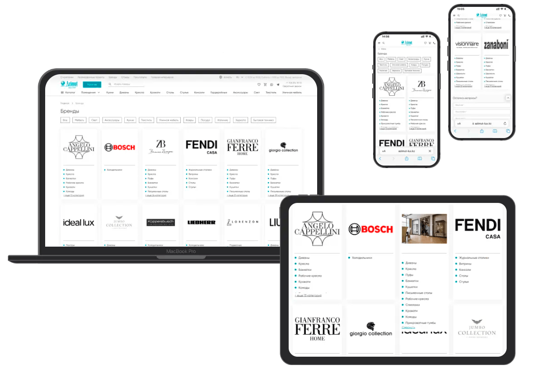 Все бренды собраны на одной странице, внутри каждого бренда разбивка по категориям товара