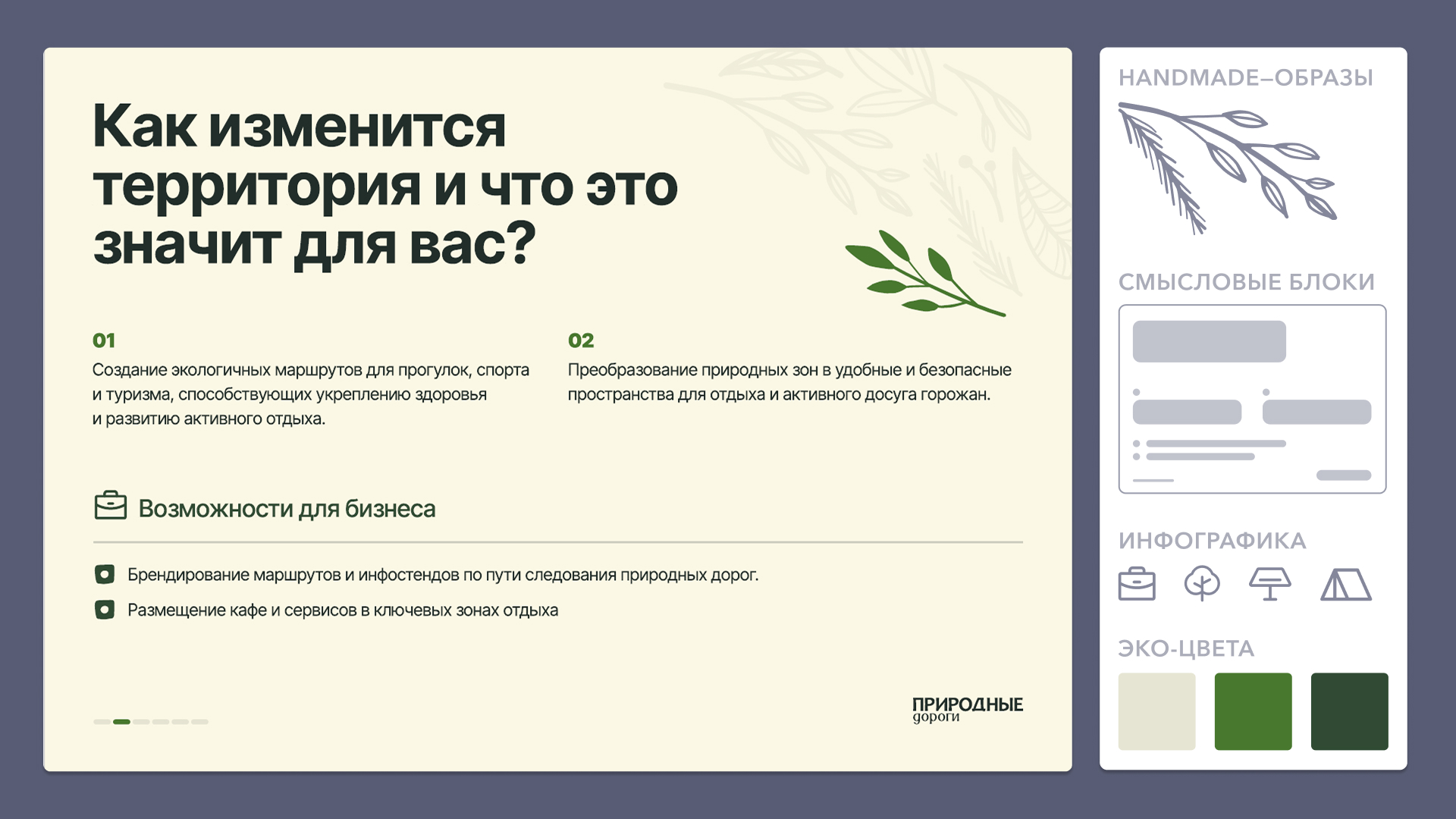 В подобных проектам мы рекомендуем делать не только презентации в формате .pdf, но и презентационные сайты, лендинги, которые могут служить не только удобным инструментом демонстрации проекта, но и собирать обратную связь и заявки от заинтересованных лиц.